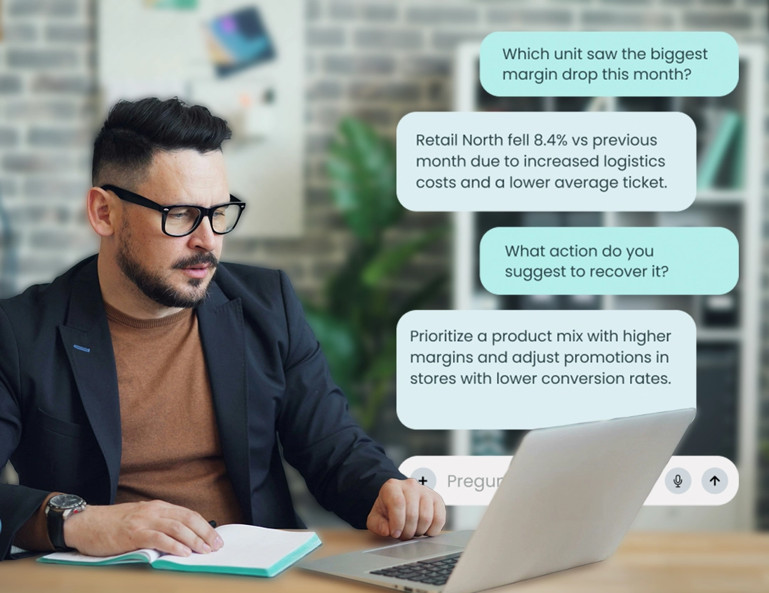 Nueva experiencia para que líderes y equipos consulten métricas en lenguaje natural, con respuestas explicables y accionables.